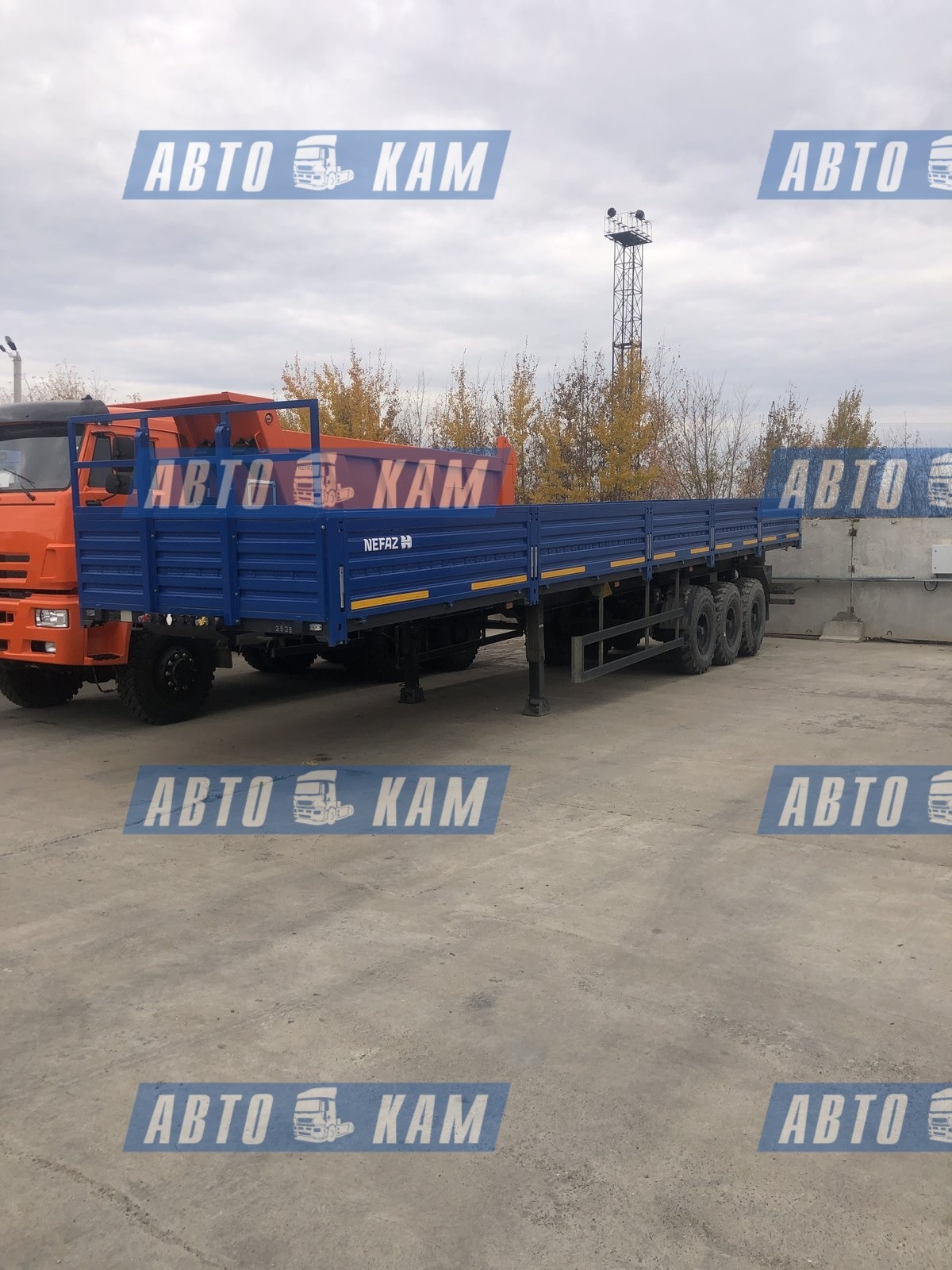 Трехосный бортовой полуприцеп НЕФАЗ 93341-07 предназначен для перевозки различных грузов по пересеченной местности в составе автопоезда с тягачами-вездеходами с высотой ССУ 1550 мм. Подвеска рессорная, оси НЕФАЗ, односкатная ошиновка (425/85R21).